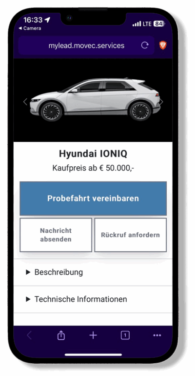 Ihre Kundschaft kann sofort eine Probefahrt buchen, eine Anfrage senden oder einen Rückruf anfordern.